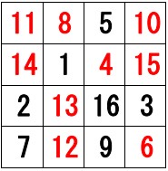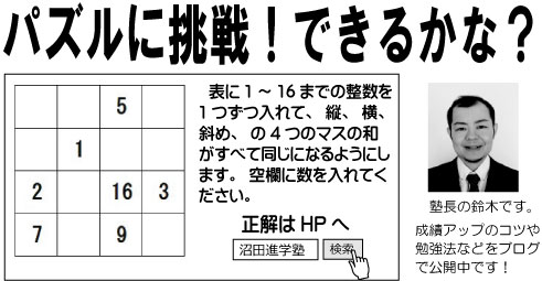4マス×4マスの問題です。通常の3マス×3マスに比べると難易度が上がります。